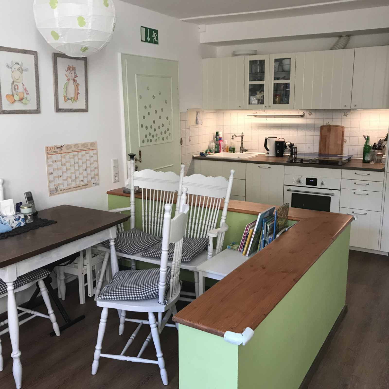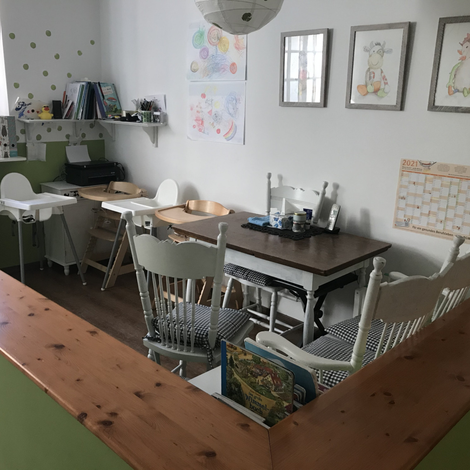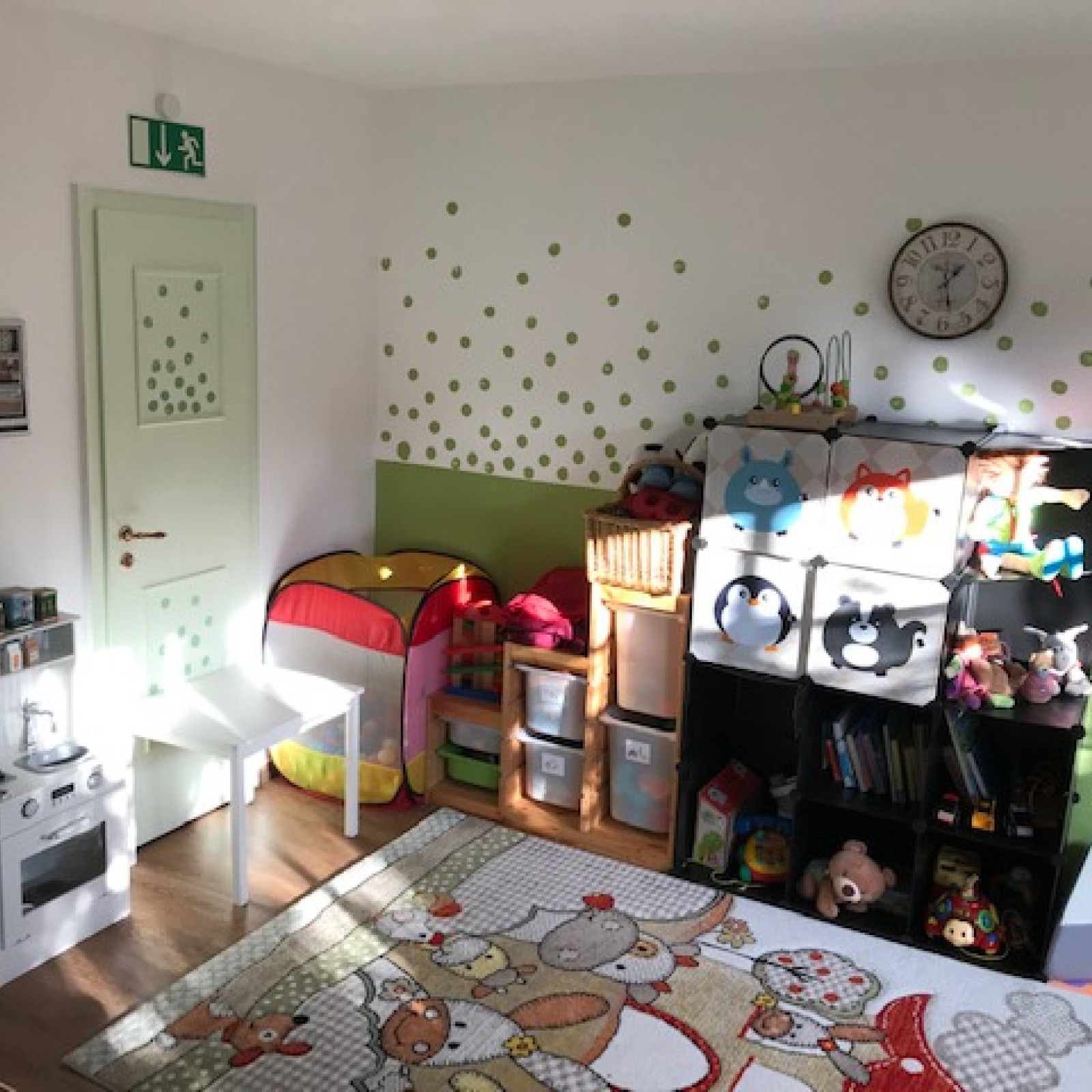 Kinder haben besondere Bedürfnisse. Für den Mittagsschlaf oder um sich auszuruhen gibt es den Schlafbereich. Die Küche ist besonders wichtig: hier bereiten ich die Mahlzeiten zu und wir lassen es uns zusammen in der Essecke schmecken. Im Aufenthaltsraum gibt es verschiedene Bereiche zum Basteln oder Spielen – manche Bereiche werden auch für verschiedene Anlässe umgeräumt. In den Räumen wird natürlich nicht geraucht.